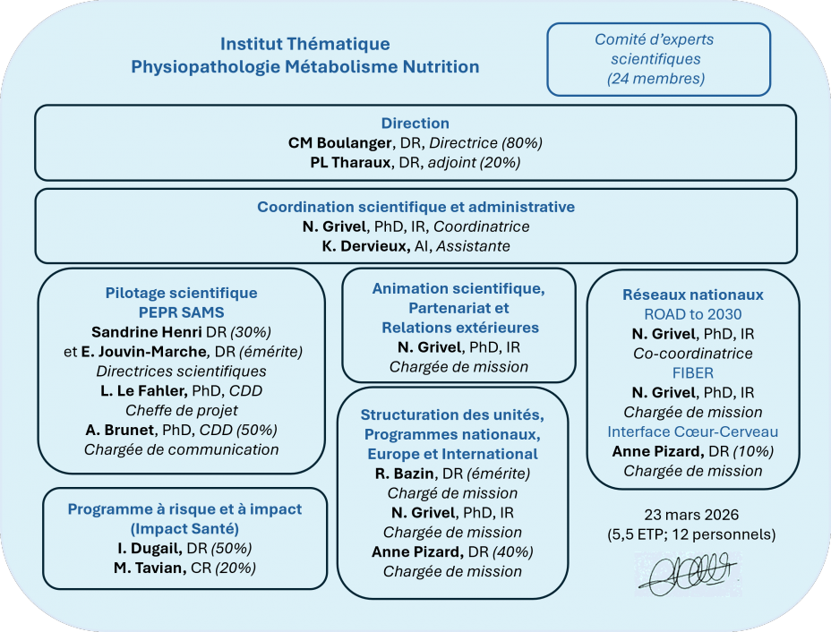 Jean-François Arnal (PU-PH) Guillaume Assié (PU-PH) Justine Bertrand-Michel (IR, Inserm) Gisèle Bonne (DR, Inserm) Lionel Brétillon (DR, Inrae) Giuseppina Caligiuri (DR, Inserm) Nadine Cerf-Bensussan (DR, Inserm) Karine Clément (PU-PH) Hélène Duez (DR, Inserm) François Fenaille (Chercheur, CEA) Chloé Feral (DR, Inserm) Pascale Gaussem (PU-PH)